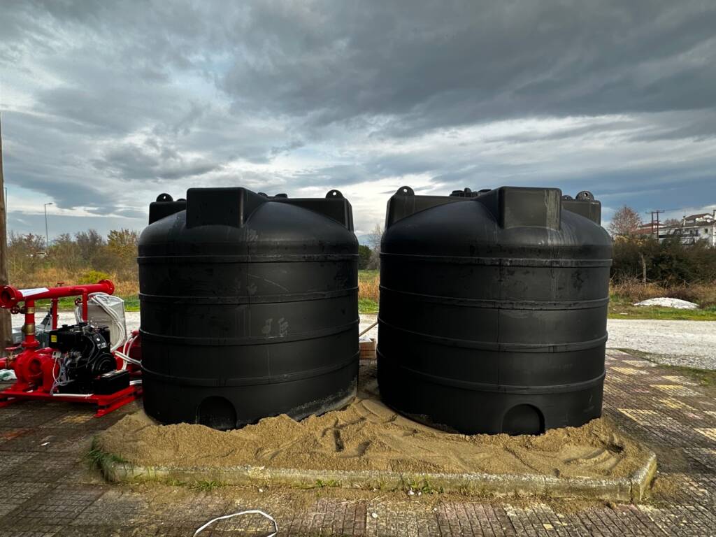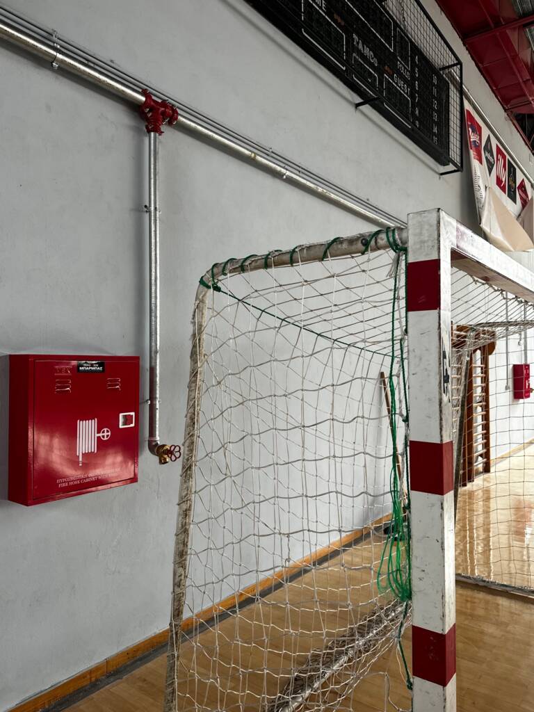 Προμήθεια και εγκατάσταση πυροσβεστικού συγκροτήματος σε χώρο λεβητοστασίου. Κατασκευή δικτύου νερού με σωλήνες ειδικού τύπου και τοποθέτηση πυροσβεστικών φωλεών και πυροσβεστικών σταθμών στο εσωτερικό του γηπέδου.