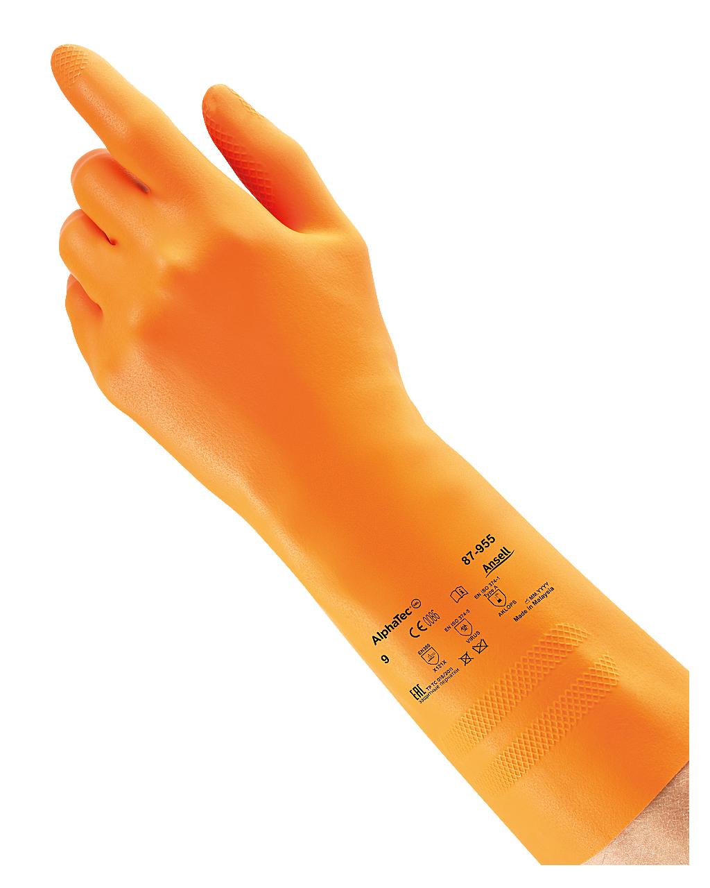 Γάντια εργασίας AlphaTec® 87-955. Φτιαγμένα από 100% φυσικό ελαστικό και κατά 50% παχύτερα από τα υπόλοιπα τυποποιημένα γάντια. Προσδίδουν ταυτόχρονα εξαιρετική αντοχή στους μηχανικούς κινδύνους και αυξημένη χημική προστασία. Κατάλληλα σε εφαρμογές βαθέος τύπου οπού η αίσθηση της αφής έχει πρωταρχικό ρολό. Τα AlphaTe® 87-955 διασφαλίζουν υψηλά επίπεδα αντοχή σε πολλές κετόνες, άλατα, απορρυπαντικά, αλκοόλες, αλκάλια και λίπη. H 100% βαμβακερή επένδυση προσφέρει απαλότερη αίσθηση και βοηθά στην απορρόφηση της εφίδρωσης.Κατατάσσονται σε γάντια ΜΑΠ κατηγορίας ΙΙΙ και είναι πιστοποιημένα σύμφωνα με: EN 388:2016 (X121X), EN ISO 374-1:2016 Type Α (AKLOPS), EN ISO 374-5:2016, EN 420:2003+A1:2009.Υλικό: Φυσικό υλικό με επένδυση flockΜανσέτα: ΊσιαΤύπο φινιρίσματος: Με ρόμβουςΧλωριωμένοAQL 1.5Πάχος: 0,73mmΜήκος: 325mmΜέγεθος: 7,5, 8, 9, 10, 11Συσκευασία: Ζεύγος [12 ζεύγη συσκ., 12 συσκ. κιβώτιο]Κατστής: AnsellΠροτεινόμενη Εφαρμογή: Εργασίες βαρέως τύπου όπου απαιτείται ευαισθησία στην αφή, χημικές διεργασίες και παρασκευές, βιομηχανικές επισκευές