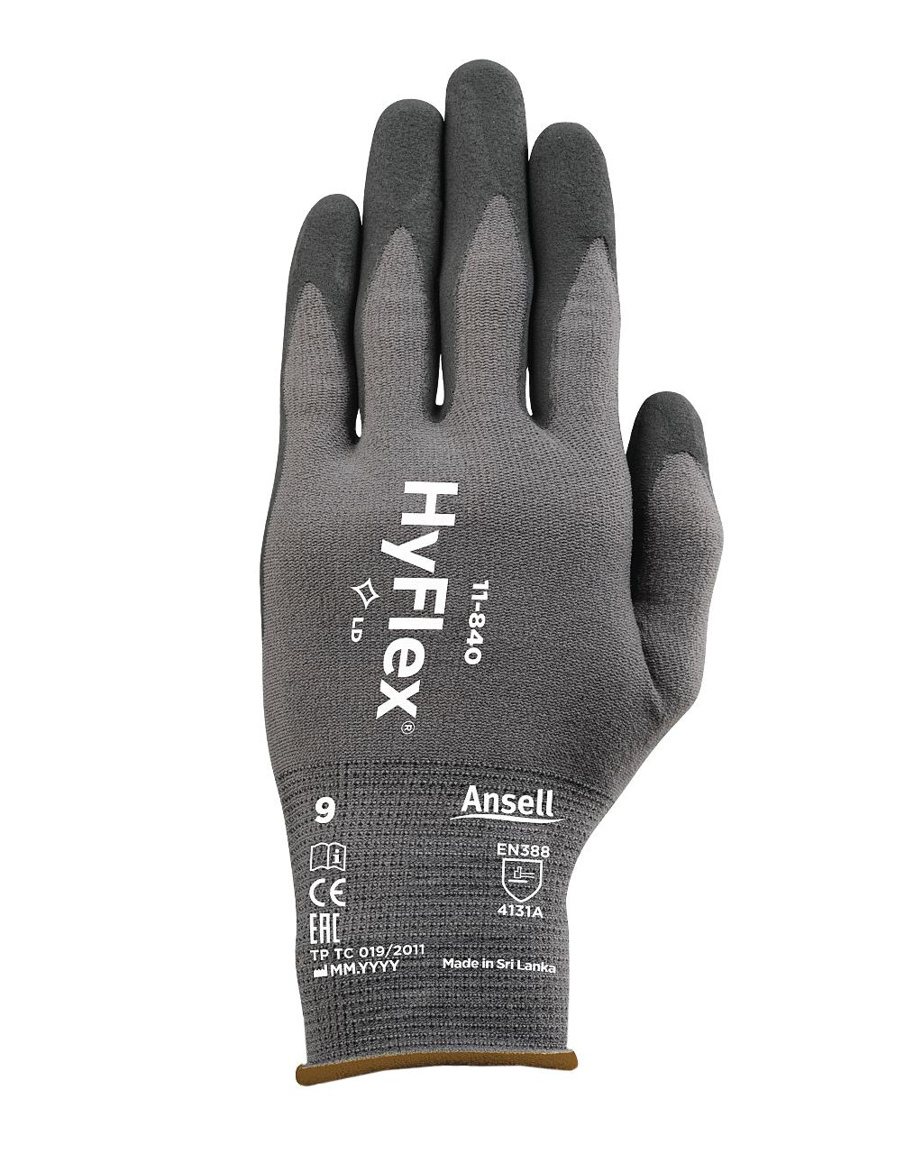 Γάντια εργασίας Hyflex® 11-840. Φτιαγμένα από πλεκτό Nylon, Spandex, χωρίς ραφές, για άνετη εφαρμογή και επικάλυψη από λεπτό αφρώδες νιτρίλιο FORTIX™. Η εξαιρετικά λεπτή επικάλυψη νιτριλίου πάχους 1.25mm διπλασιάζει το κράτημα και αυξάνει κατά 20% το χρόνο ζωής του γαντιού. Ενισχυμένη διαπνοή για μεγαλύτερη άνεση.Τα Hyflex® 11-840 κατατάσσονται σε γάντια ΜΑΠ κατηγορίας ΙΙ και είναι πιστοποιημένα σύμφωνα με το: EN 388:2003 (4231), EN 388:2016 (4131Α)Φορέας: Nylon, SpandexΕπικάλυψη: Αφρώδες νιτρίλιοΜανσέτα: Ελαστική πλεκτήΠλέξη χωρίς ραφές για άνετη εφαρμογήΧωρίς latex, xωρίς σιλικόνηAnsell GRIP™ TechnologyΕλεγμένο έναντι επιβλαβών ουσιών OEKO-TEX®-Standard 100 Μήκος: 200-275mmΜεγέθη: 8, 9, 10, 11Πλένεται στο πλυντήριο στους 40°CΣυσκευασία: Ζεύγος [12 ζεύγη συσκ., 12 συσκ. κιβώτιο]Κατστης: AnsellΠροτεινόμενη Εφαρμογή: Συναρμολόγηση μικρών αντικειμένων, διαχείριση υλικών, εφαρμογή συστημάτων και βίδωμα