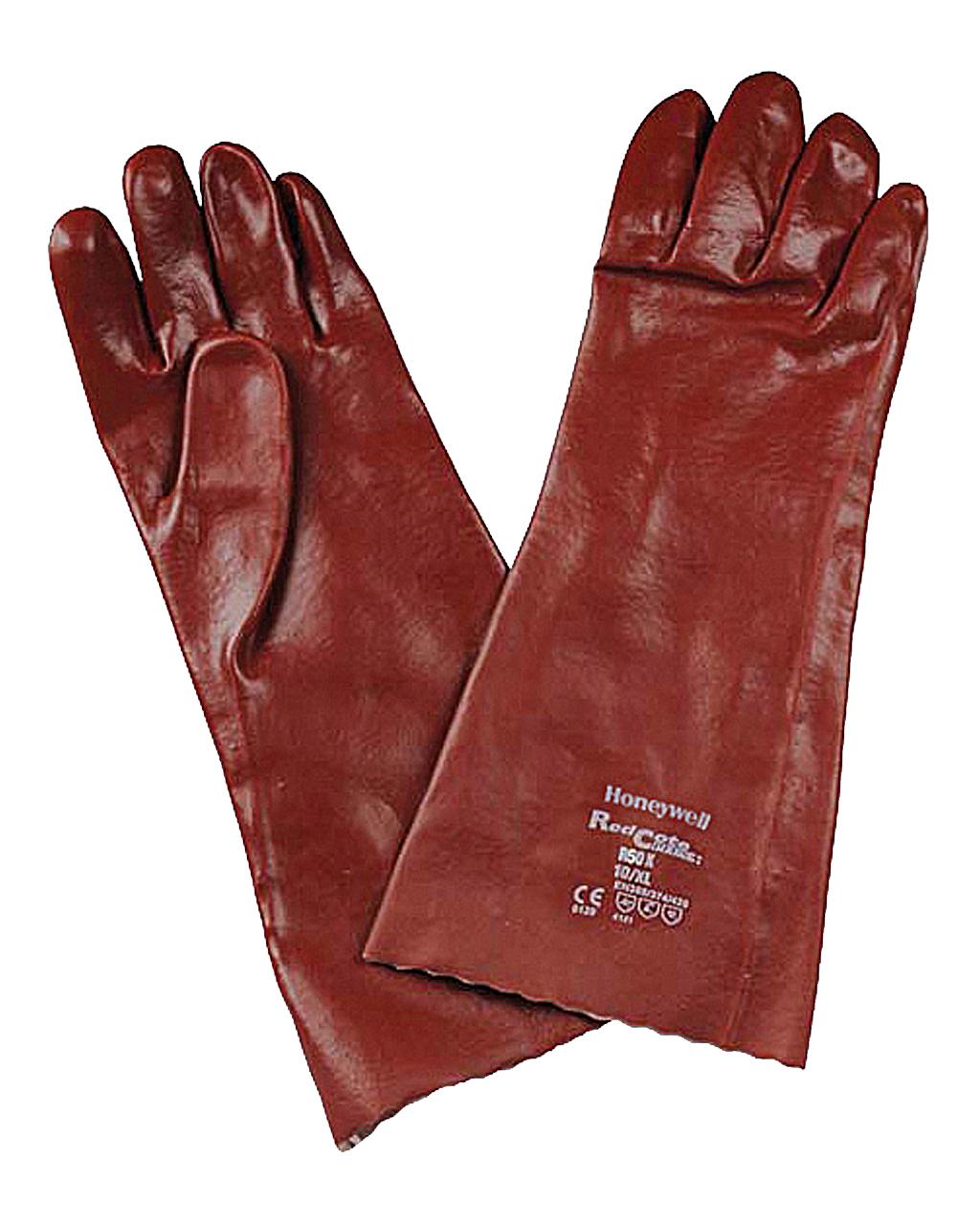 Γάντια εργασίας Redcote plus – R50X . Φτιαγμένο από PVC πάχους 1,4mm και βαμβακερή φόδρα για καλύτερη υγιεινή. Φέρουν χαμηλές αντοχές σε κετόνες, αρωματικούς και αλογονομένους υδρογονάνθρακες. Το λείο φινίρισμα προσφέρει εξαιρετική αφή και άριστη επιδεξιότητα. Διαθέτουν ειδικό σχεδιασμό για ξεκούραστη και εκτεταμένη χρήση. Κατατάσσονται σε γάντια ΜΑΠ κατηγορίας ΙΙΙ και φέρουν πιστοποιήσεις: EN 388:2016 (4121X), EN ISO 374-1:2016 Type A (AKLNOT), EN ISO 374-5:2016, EN420:2003+A1:2009.Υλικό επικάλυψης: PVCΥλικό φόδρα: Βαμβάκι InterlockΤύπος φινιρίσματος: ΛείοΜανσέτα: GauntletΠάχους: 1,4mm Μήκος: 350mmΜέγεθος: 9,10Συσκευασία: Ζεύγος [12 ζεύγη συσκ., 6 συσκ. κιβώτιο]Κατστής: HoneywellΚατάλληλα για επαναλαμβανόμενη χρήση σε ελαιώδη ατμόσφαιρα. Προτεινόμενη Εφαρμογή: Χρήση σε πετροχημικά, κατασκευές, βιομηχανία.